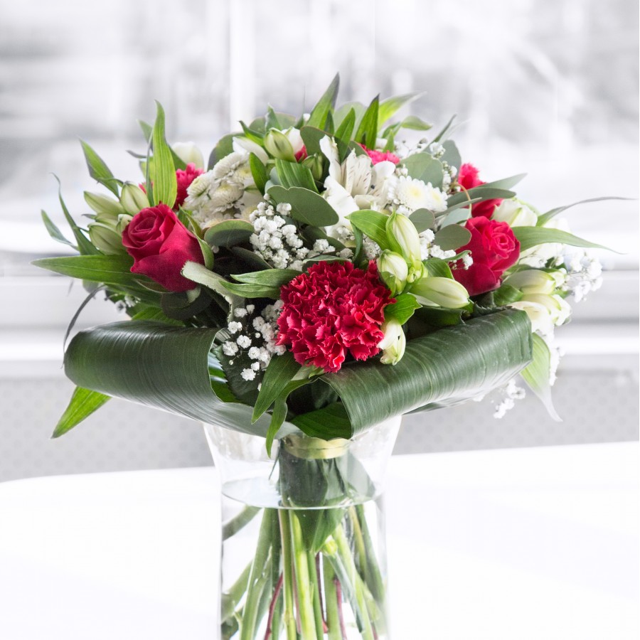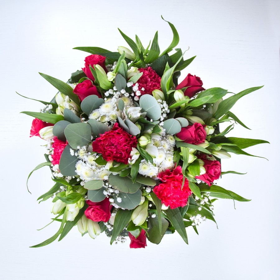 This refined floral arrangement is designed to ignite your imagination. Featuring a blend of white chrysanthemums, enchanting gypsophila, and passionate red roses, combined with gentle carnations, white alstroemeria, and aspidistra leaves, it promises a visual delight and lasting impression. Every bloom is hand-picked to ensure they are at their freshest and most vibrant.