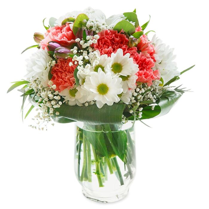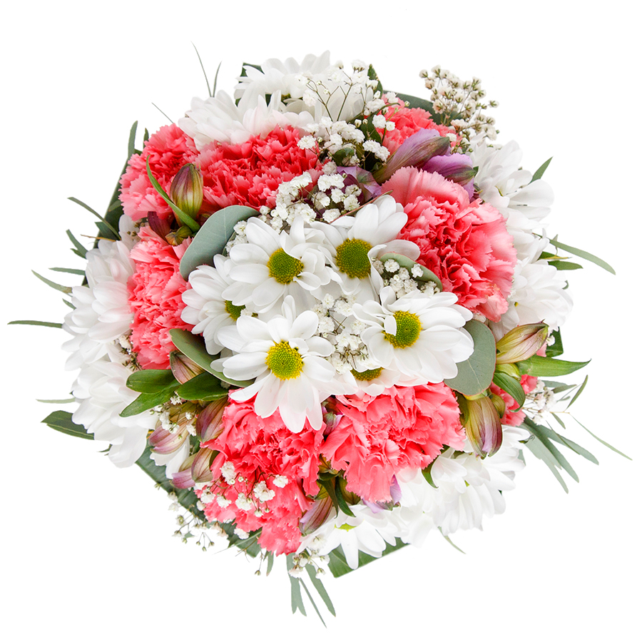 Express your heartfelt emotions with this refined bouquet, combining snow-white chrysanthemums, delicate gypsophila, charming light pink carnations, and rich aspidistra leaves. Each bloom is meticulously selected to ensure top-tier freshness and quality.